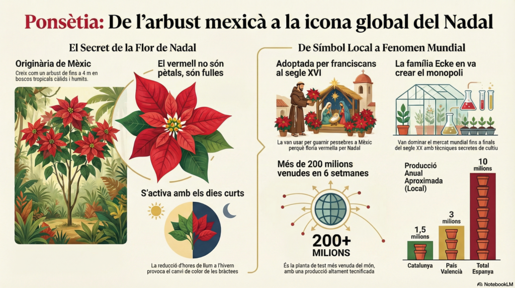 Aquesta bellesa natural va ser aprofitada ja al segle XVI pels franciscans de Taxco, a Mèxic, que van utilitzar la planta com a recurs per guarnir el pessebre atès que oferia el seu màxim esplendor justament durant les festes hivernals. Des d’aquells primers usos simbòlics, la ponsètia ha recorregut un llarg camí històric: des de l’impuls del primer ambaixador americà Joel Roberts Poinsett, que li va donar el seu nom comú, fins a la producció a gran escala de la família alemanya Ecke. Avui dia, la seva producció està altament tecnificada i s’ha convertit en la planta de test més venuda del món, amb una producció que supera els 200 milions d’unitats en només sis setmanes. A casa nostra, el cultiu s’ha arrelat fortament; Catalunya en produeix prop d’1,5 milions anuals, especialment al Maresme.